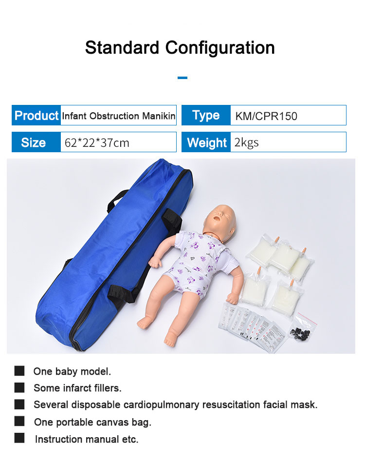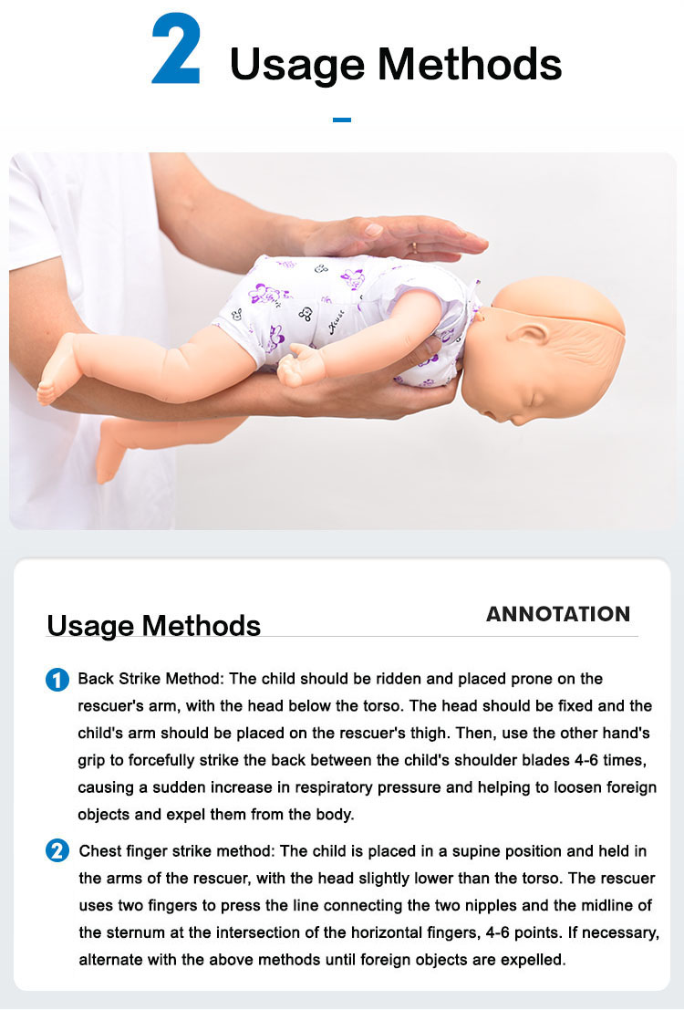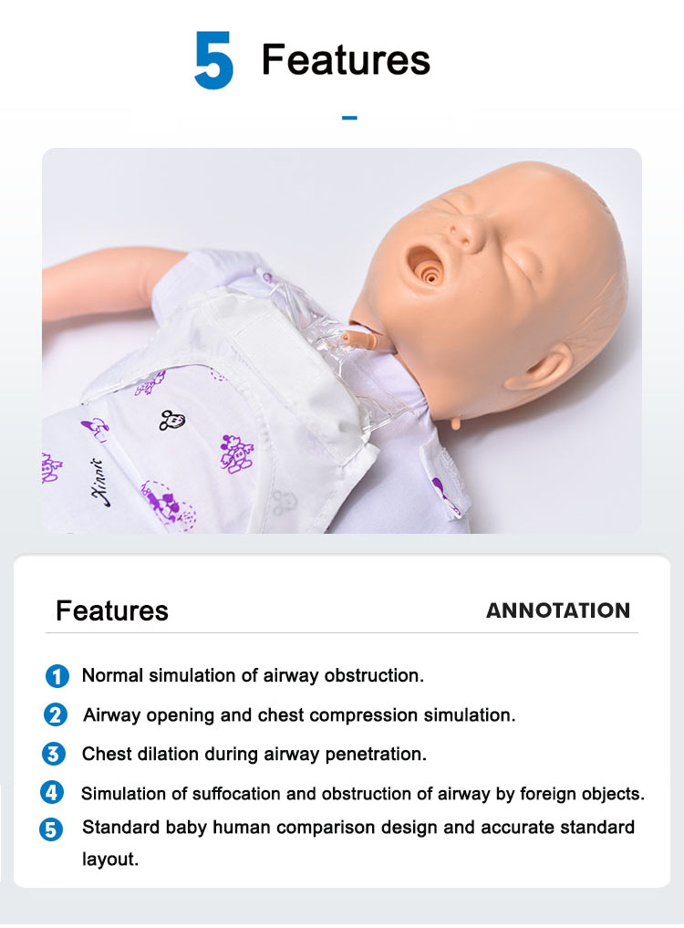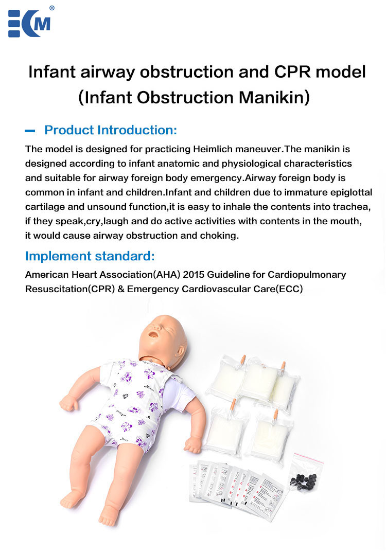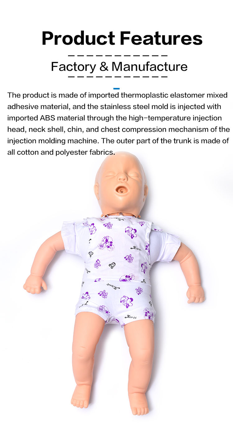 The model is designed for practicing Heimlich maneuver.The manikin is designed according to infant anatomic and physiological characteristics and suitable for airway foreign body emergency.Airway foreign body is common in infant and children.Infant and children due to immature epiglottal cartilage and unsound function,it is easy to inhale the contents into trachea,if they speak,cry,laugh and do active activities with contents in the mouth,it would cause airway obstruction and choking.